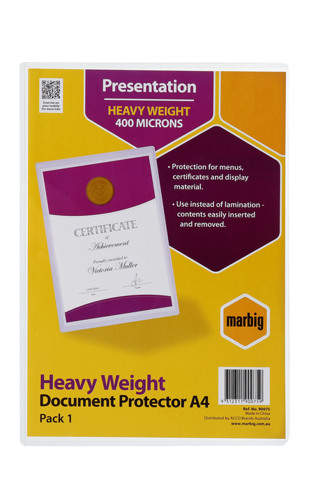 The Marbig A4 Document Protector is designed to provide excellent protection for your important documents such as menus, certificates, and display materials. Made from high-quality PVC, it ensures durability and a crystal-clear view of your contents. Ideal for professionals and students alike, this document protector is a reliable choice for keeping your papers safe and presentable. The A4 size makes it perfect for standard documents, fitting seamlessly into your filing system or presentation folder.