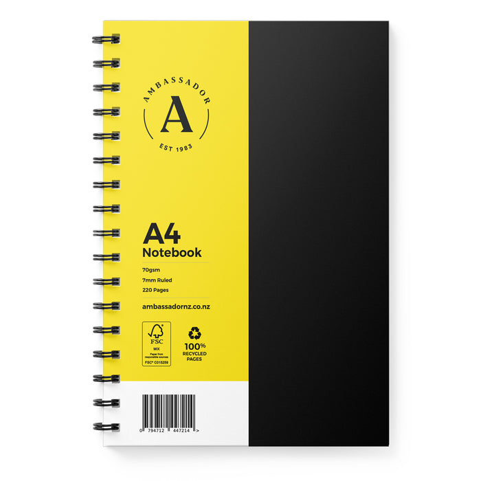 Ambassador Notebooks are FSC Mix certified with inside pages made from 100% recycled paper. Black Wiro Hardcover Notebook FSC Mix Certified 100% Recycled Pages 70gsm pages with 7mm ruling