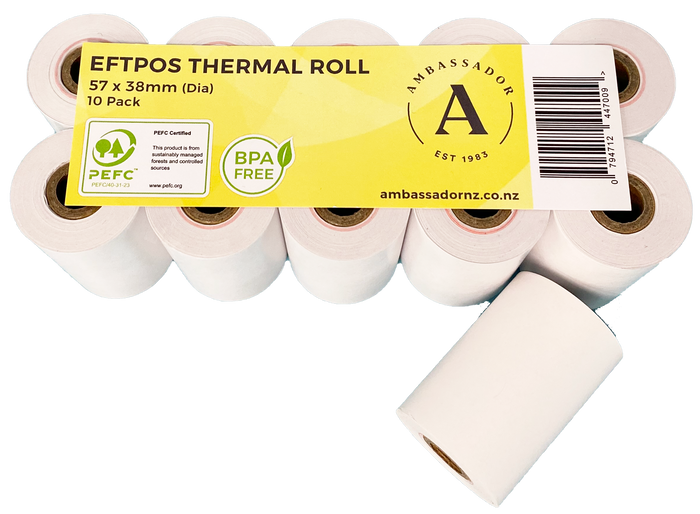 All Ambassador rolls use a cardboard core with an inner diameter of 12mm. Paper weight for all rolls is 58gsm. Thermal image lasts up to 7-years when stored in appropriate conditions. FSC Certified, BPA Free. Machine Rolls paper is recyclable. Eftpos & Receipt Paper Rolls