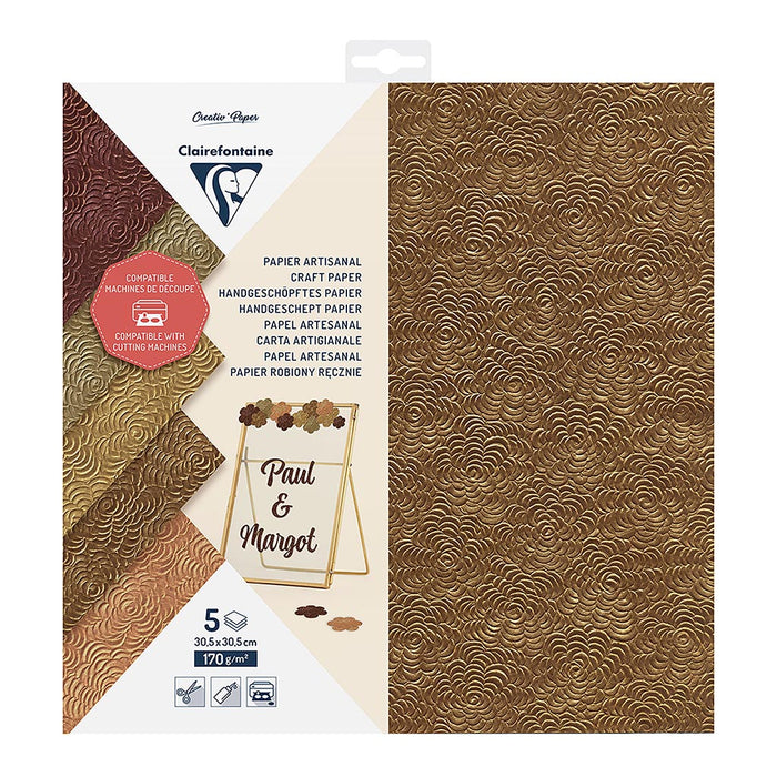Clairefontaine Craft Paper sheets are essential for all creative adventures: cards, decorations, accessories and much more. The 170gsm paper can be cut, grooved, folded... to make all kinds of craft projects. Craft paper fits perfectly with cutting needs, whether with popular cutting machines or with other craft tools. Tip: We suggest using the rotary blade. Pack of 5 colours: Bordeaux, Sand, Gold, Salmon and Copper. 30.5cm x 30.5cm.
