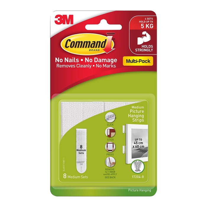 Forget about nails, screws and tacks, Command Picture Hanging Strips are fast and easy to hang – no more holes to worry about! Strips snap and lock together, providing a secure strong hold. Using the revolutionary Command Adhesive, they hold strongly on a variety of surfaces, including painted walls, wood, tile and more. Yet, they remove cleanly - no holes, marks, sticky residue or stains. Each pack contains 8 sets of medium white strips. 4 sets of medium strips hold up to 5.4kg. Ideal for frames no bigger than 46cm x 61cm in size.