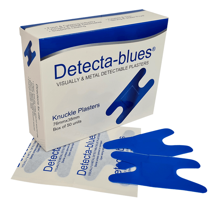 The range of Detecta-blue Adhesive Plasters - feature a bright blue coloration, making them instantly Visually Detectable if they come into contact with food. An aluminium strip behind the dressing pad ensures they are easily Metal Detectable by metal detection devices in food processing facilities, kitchens, restaurants etc. These Blue Plasters are specifically designed for the food industry and food preparation areas.