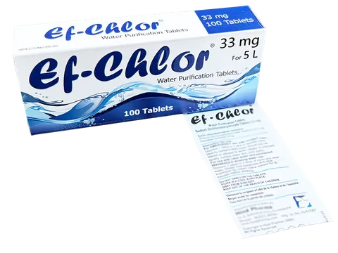 EF-Chlor 33 mg water purification tablets provide fast, reliable disinfection for stored or emergency water supplies. Each NaDCC (sodium dichloroisocyanurate) tablet treats 5 litres of water, killing bacteria, viruses and other harmful microorganisms that can cause water-borne disease.