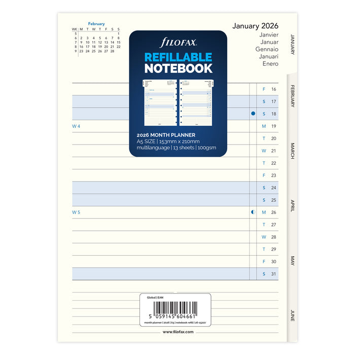 2026 Filofax A5 Refill Notebook Monthly Diary Planner, 148mm x 210mm