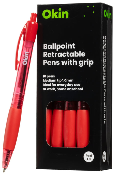 Okin Ballpoint Retractable Pen with Grip Medium Tip Red Pens x 10's pack