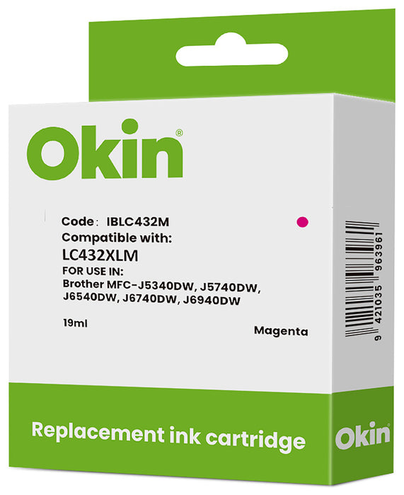 Okin Ink Cartridges are designed to give outstanding performance with your inkjet printer, from the first page to the last. They offer outstanding quality and print professional looking documents and photos at an economical value per page. Quick and simple to replace, they are a staple for any office. Magenta ink cartridge. Prints up to 1,500 pages. Compatible with Brother MFCJ5340DW, MFCJ5740DW, MFCJ6540DW, MFCJ6740DW and MFCJ6940DW inkjet printers.