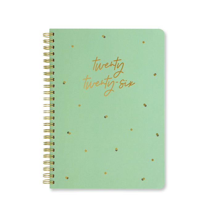 Letts of London Diary Celebrate A5 Week to View in Mint Green. This diary features a polka-dot print and beautiful foiled details. It's the perfect tool for you to record the year in! FEATURES - Social diary style - Multilanguage - White paper - From sustainable sources - Wiro construction - Double-sided pocket - Pop-out accessories - Gold foil motif