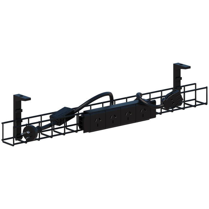 Features: Designed to work with the Rapid or Rapid Premium desk systems 1x 4 GPO Power Rail Option for a Starter Lead or an Interconnect Lead 50 x 950mm Wire cable management tray/basket 2 x mounting brackets Power outlets clips to basket Mounting brackets screw to underside of a workstation or back into a modesty panel Basket snaps into the bracket easily
