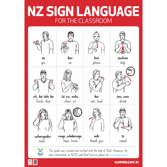 The Warwick Classroom Sign Language Chart is a laminated teaching resource for young students. It includes hand signal images with English and Te Reo definitions.